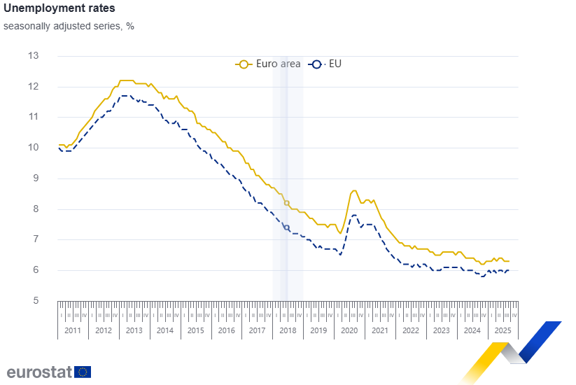 Eylül 2025'te, Euro Bölgesi'ndeki işsizlik, Eurostat'a göre, üst üste üçüncü ay yüzde 6,3 seviyesinde sabit kaldı. Bu oran, Ekim ve Kasım 2024'te kaydedilen yüzde 6,2'lik tarihi düşük seviyenin biraz üzerinde ve Ocak 1999'daki Euro'nun başlangıcından önceki seviyenin hemen üzerinde. Avrupa Birliği genelinde ise işsizlik oranı yüzde 6,0 seviyesinde sabit kalarak Ağustos ayındaki oranı korudu.